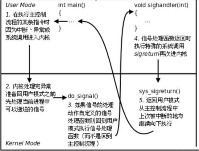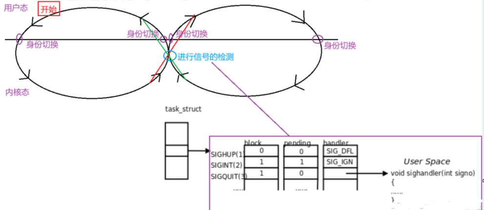 一个进程在CPU上面被调度是,因为中断,异常或者系统调用,CPU就会从用户态转化为内核态,在内核态处理完问题之后就会去检查一下,首先进程会去检测PCB中的pending信号集,pending信号集中保存着信号,即进程是否收到信号,如果收到了信号,之后检测block信号集,查看是否阻塞了该信号,如果阻塞了就不处理,转为用户态,如果没有阻塞,就检查是否把信号转为自定义函数,没有就处理信号,进程也就退出了,如果是忽略信号,返回用户态,如果是自定义函数,就去执行自定义函数,然后会执行特殊的sigreturn再次进入内核,然后从内核返回用户态。