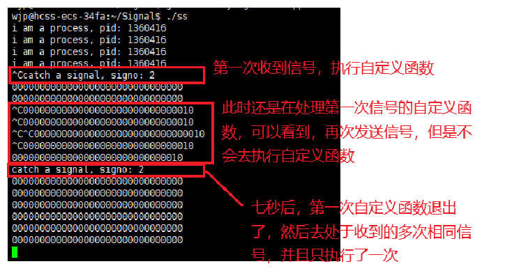 测试3:处理信号的自定义函数期间,收到一次或多次相同信号,会将penging表对应比特位置为1,然后处理自定义函数完了之后,再去处理相同的信号,只会处理一次(这个处理其实是再处理了自定义函数之后,会执行特殊的sigreturn再次进入内核,内核返回用户态的时候处理的)