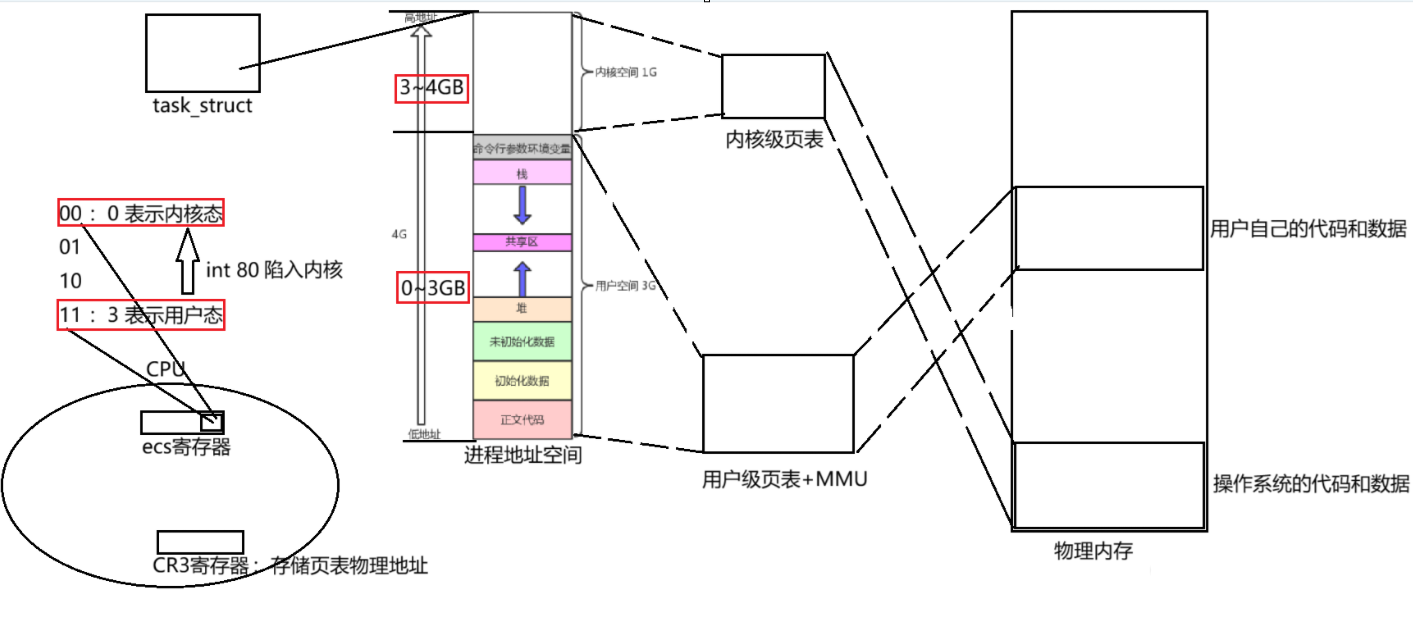 对于一个进程,有进程的PCB,进程地址空间,以及页表,以及用户在物理内存中的代码和数据,其实这个页表是用户级页表,如何理解呢?之前小编一直在谈地址空间中0~3GB的用户空间,其实这个0~3GB的虚拟地址是通过用户级页表映射到物理内存中用户自己的代码和数据,我们执行用户的代码是在0~3GB的用户的虚拟地址空间中的正文代码开始执行的。