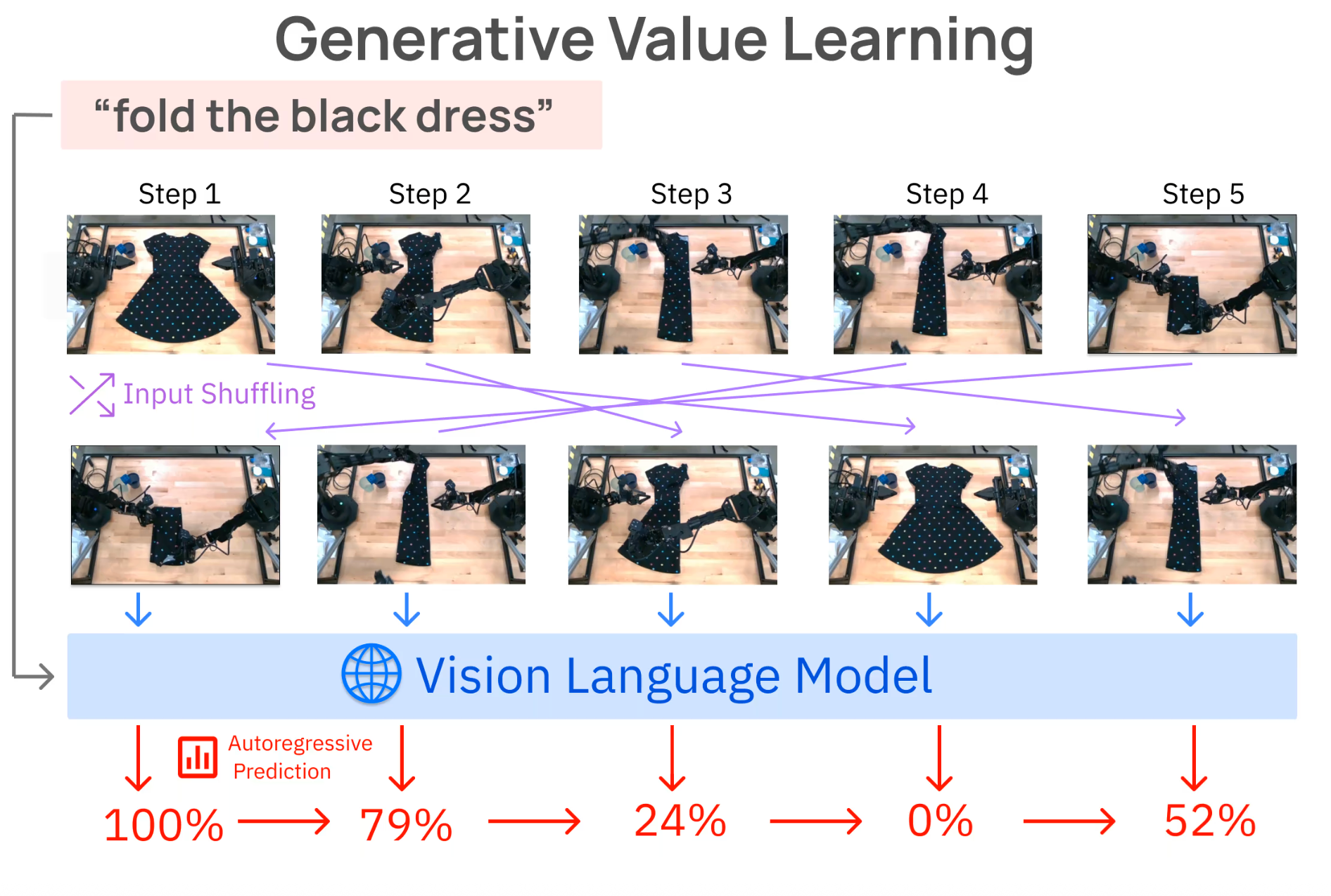 锚点帧(Anchor Point):为了让模型理解进度的起点,GVL 在打乱帧序列时,始终保留原始视频的第一帧不被打乱,将其作为参考原点(Anchor Point) 。这让模型明确了"0% 进度"的具体画面状态。