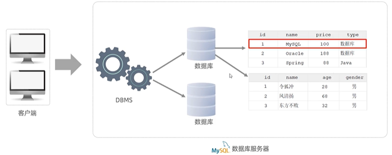 | 数据库管理系统 | DataBase Managememt System(DBMS) | 操纵和管理数据库的大型软件。 |