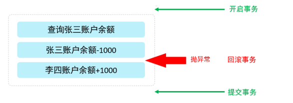 比如对于转账操作,我们就需要通过事务来保障它的安全性:在业务逻辑执行之前开启事务,执行完毕后提交事务。如果执行过程中报错,则回滚事务,把数据恢复到事务开始之前的状态。