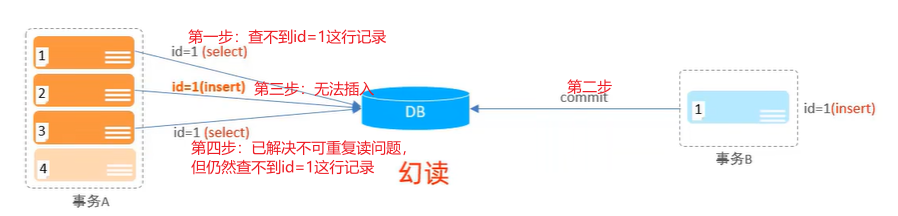 定义:一个事务按照条件查询记录时,没有对应的记录行,但是在插入记录时又发现这行记录已经存在,好像出现了"幻觉"。