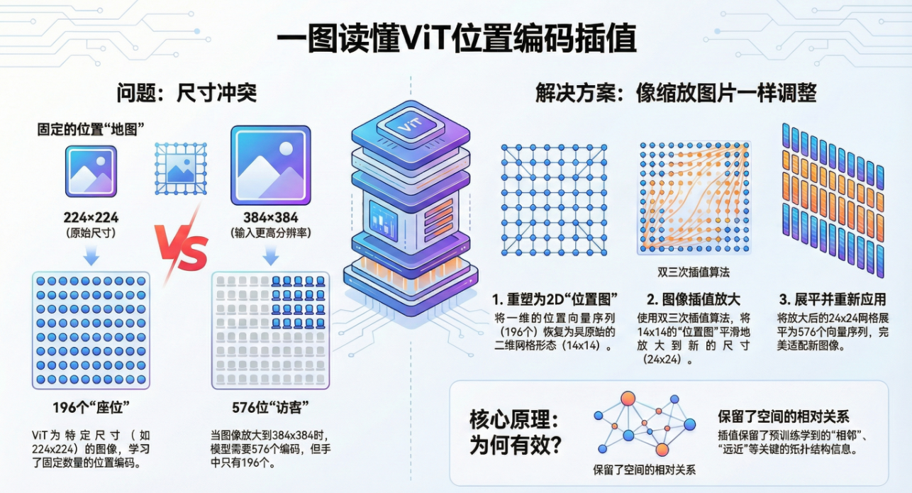 摘要:在将 Vision Transformer (ViT) 从预训练模型(如 ImageNet-1k, 224x224)迁移到工业缺陷检测或高分辨率任务(如 384x384, 512x512)时,最常见的报错就是位置编码维度不匹配。本文将用通俗易懂的"图像缩放"视角,详解为何需要插值以及底层的代码实现逻辑。
