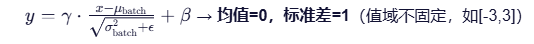 - γ,β\gamma, \betaγ,β = 可学习参数(初始=1,0)
