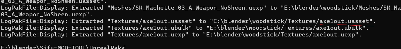 UnrealPak.exe "G:\Sifu\Sifu\Content\Paks\~mods\a\LeviathanAxe_machete.pak" -extract "E:\blender\woodstick"