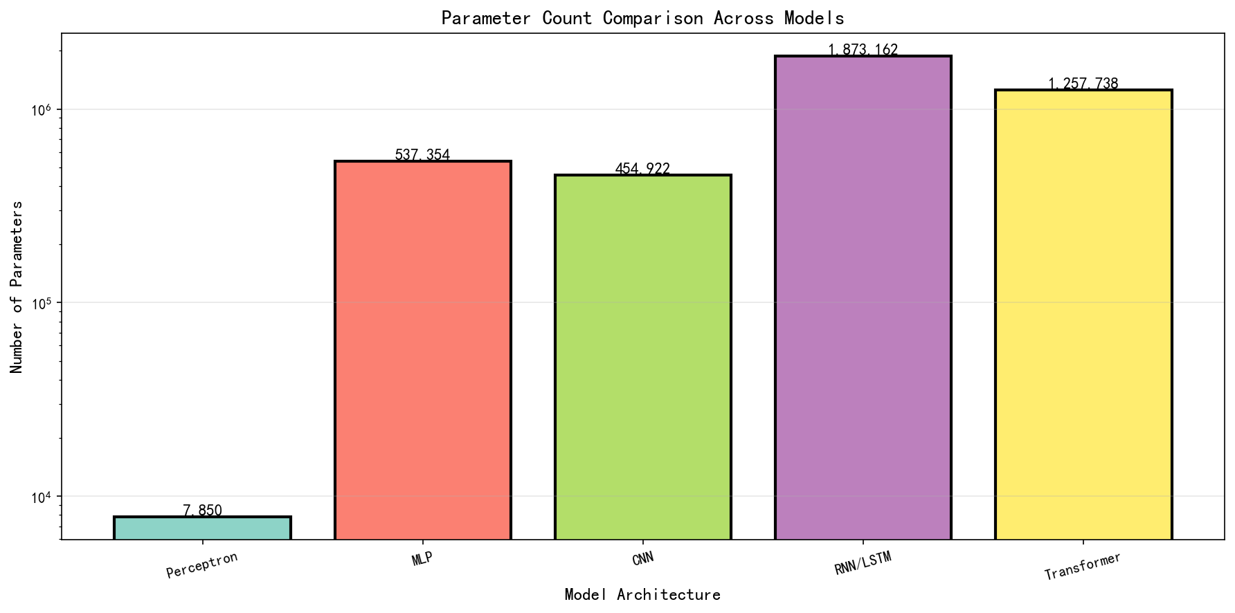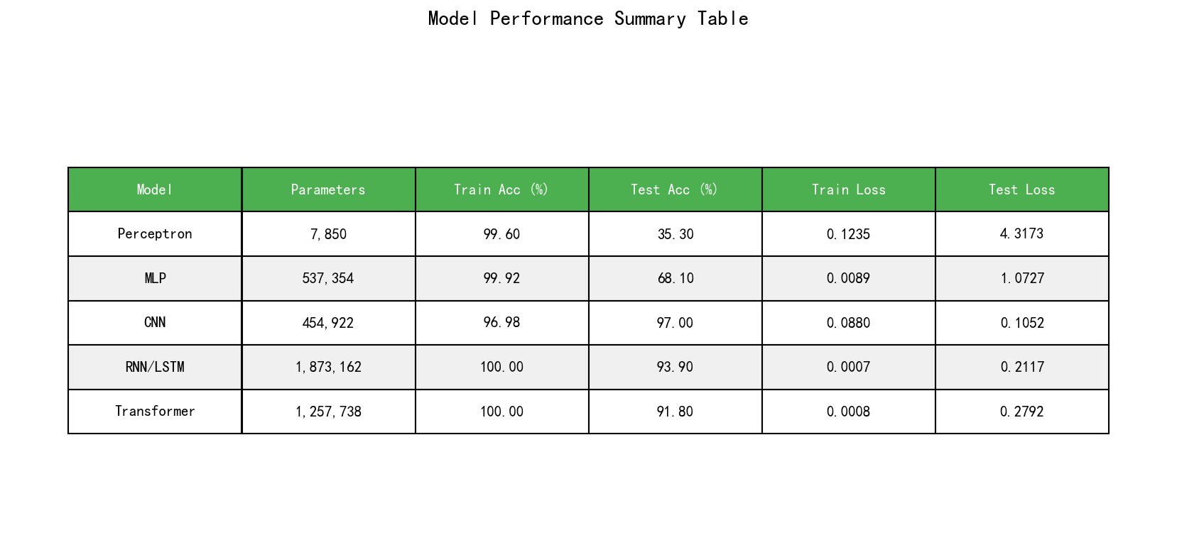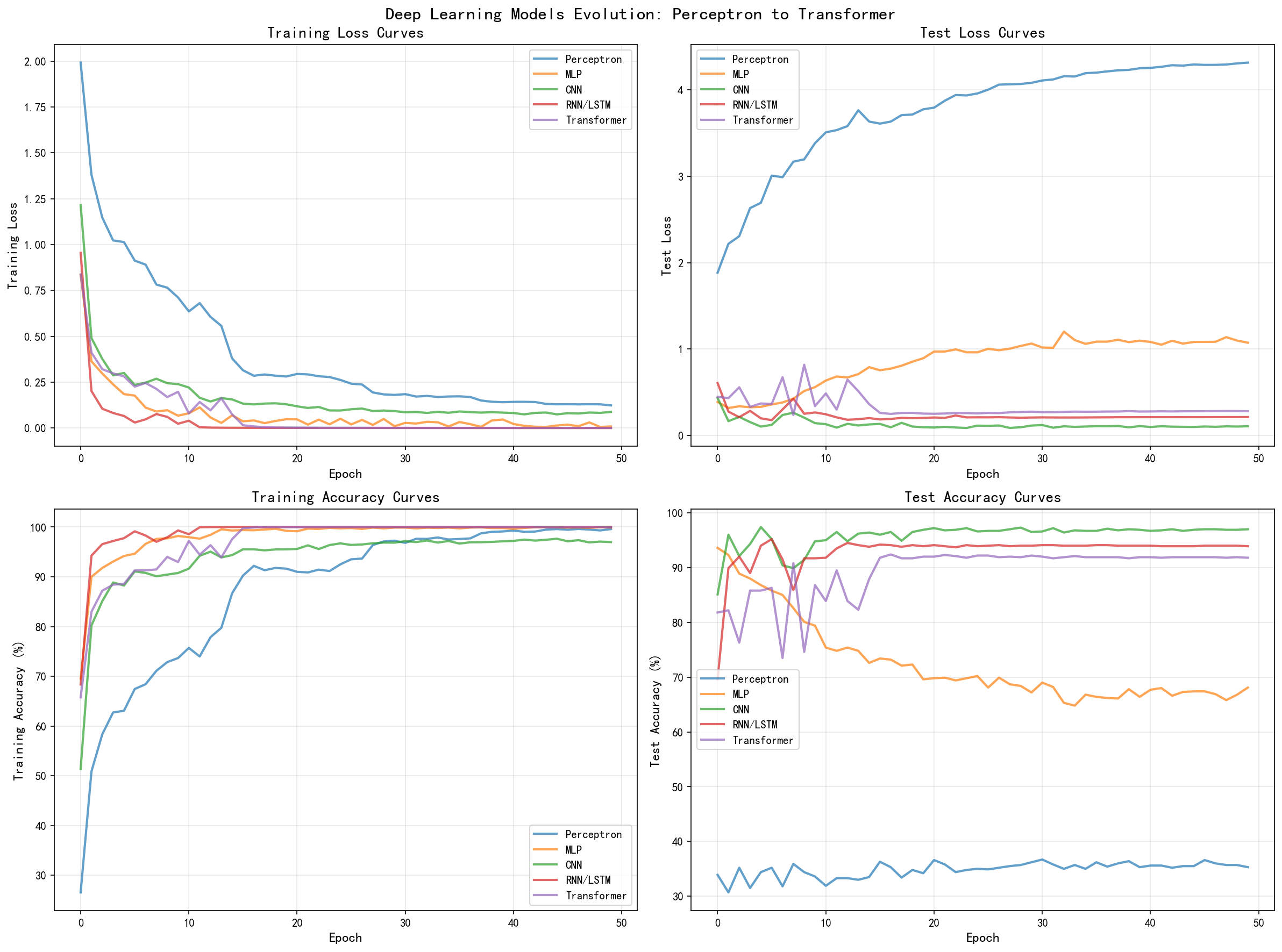 这个完整的代码实现了五种主要的神经网络模型:感知机、多层感知机、卷积神经网络、循环神经网络(使用LSTM)和简化的Transformer。代码包含以下主要特点: