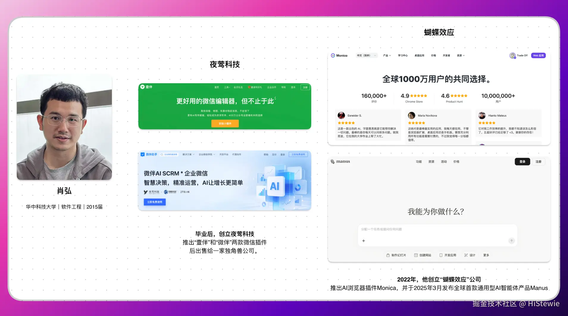 - 肖弘(CEO): 他不是典型的硅谷技术极客,而是一位深谙中国互联网玩法的连续创业者。早在 AI 爆发前,他就创办过"壹伴"、"微伴"等工具,是微信生态里最懂流量和社群裂变的人。