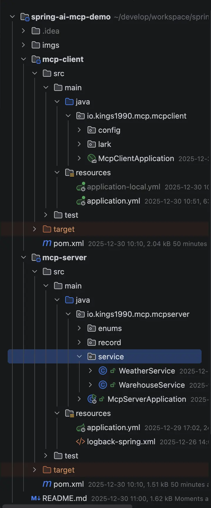 主要分为2个模块,mcp-server 和 mcp-client, mcp-client里面通过 java -jar 的形式运行 mcp 服务端,在 mcp-client 最终结合 AI 以及飞书机器人的集成实现消息的回复.