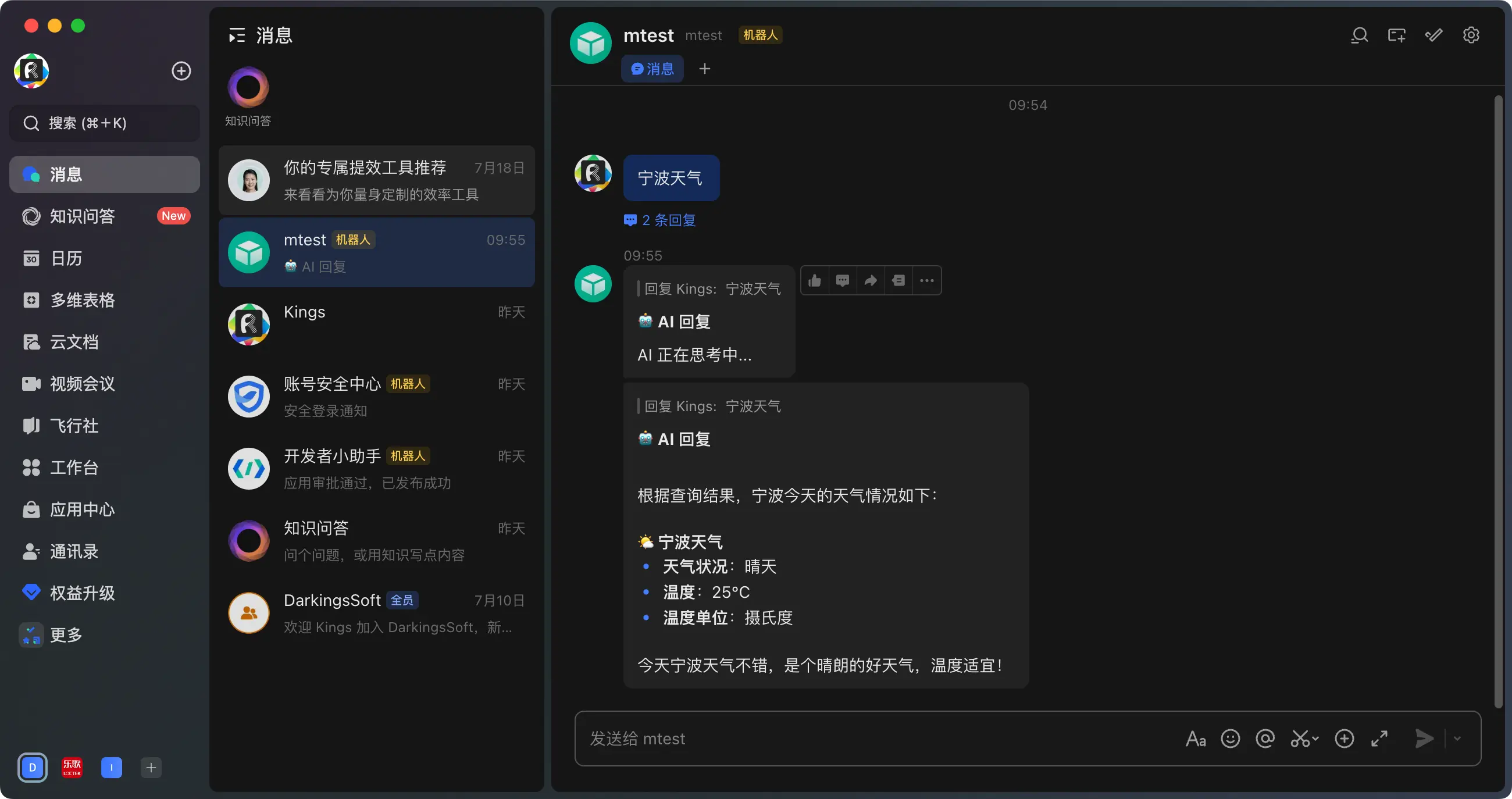 启动成功后在飞书应用里输入例如北京,等待机器人回复