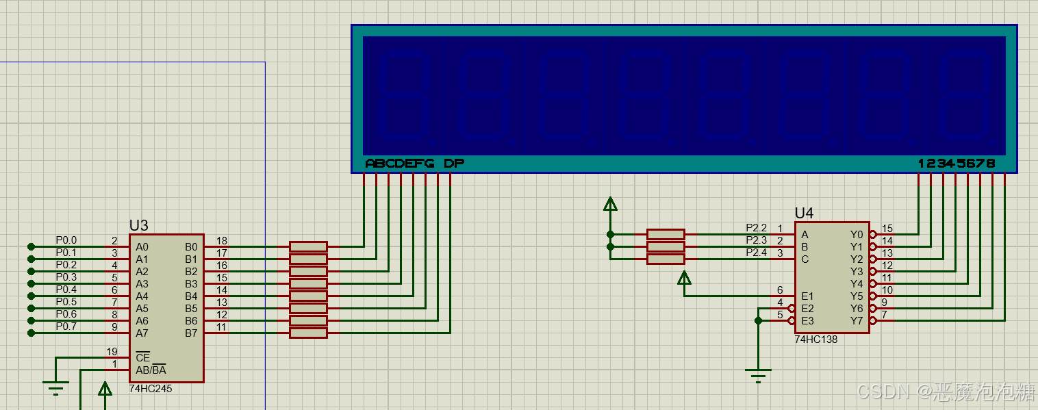 通过位选每次只打开一个数码管,然后给段选输送显示的值,然后延时,然后只打开下一个数码管的位选,给段选输出显示的值,通过每次只打开一个数码管后,设置延时时间,然后只打开下一个数码管,由于延时速度比较快,在程序操作中,第一个数码管已经不显示了,然后去显示第二个数码管,但是在人眼看到的第一个数码管和第二个数码管同时显示出来了。