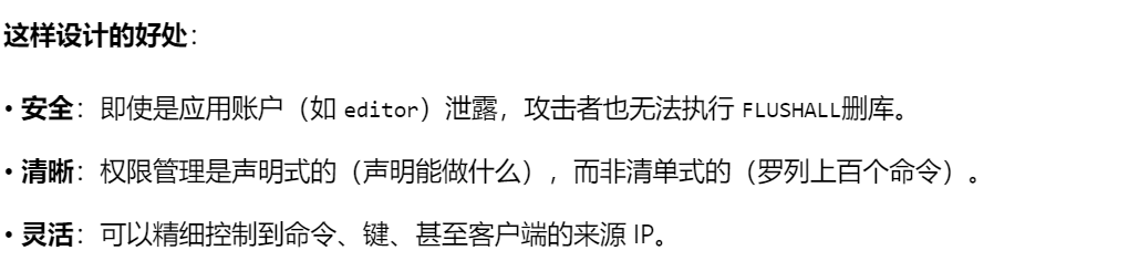 ------>使用特殊标签 allcommands允许所有命令,allkeys允许访问所有键。通常还会限制来源 IP 以增加安全。