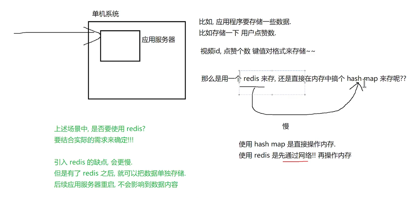 ------->如果只是单机程序,那么直接通过变量存储数据显然是更优秀的存储方式,而在分布式系统中则是redis更优秀,因为定义变量是在当前服务器进程内部的内存空间,但是进程具有隔离性。分布式系统必然涉及到多个进程在不同的主机上。此时你想访问其他进程的内存里的变量是比较困难的。所以redis是针对上面的这个需求做的一个封装,意思就是既然无法突破进程的隔离性,那就基于网络(进程间通信)将自己内存中的变量给别的进程甚至是别的主机的进程进行使用。