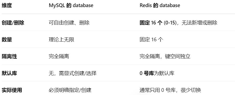 关键结论 :Redis 的"数据库"是预定义的、编号的、隔离的键空间 ,更像"命名空间"而非传统数据库。生产实践中几乎只用 0 号库。