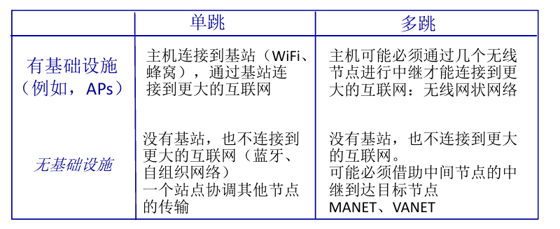 - 基础设施模式:将无线节点连接到有线网络中,移动节点之间不直接通信。