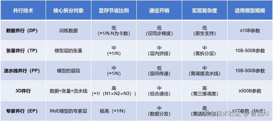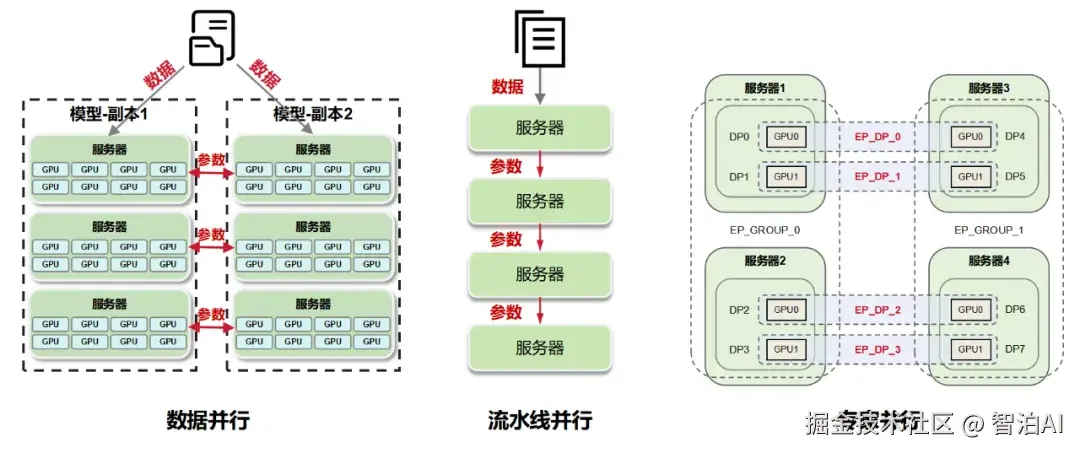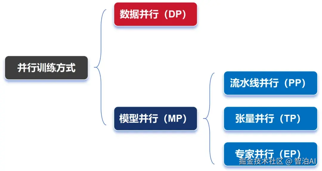 此前提到的PP(流水线并行)、TP(张量并行)和EP(专家并行),均归属于模型并行的范畴,后续将另行展开说明。