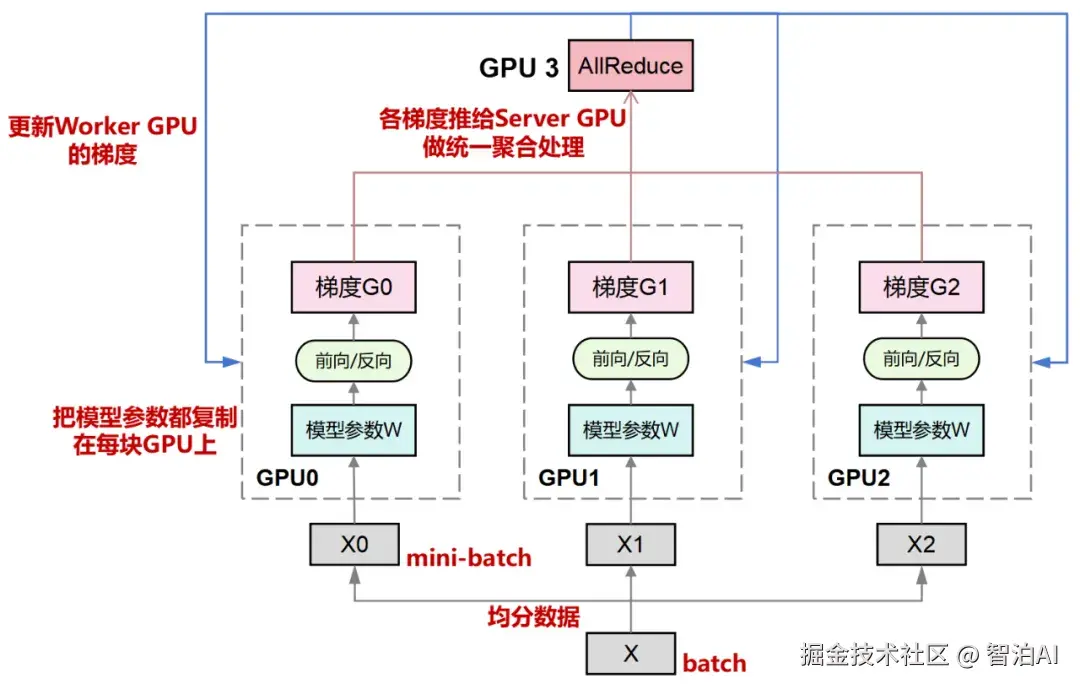 其核心理念极为直接:每个GPU均保存一份完整的模型副本,训练数据则被切分为若干小批次(mini-batch),每个批次独立分配至不同GPU并行运算。