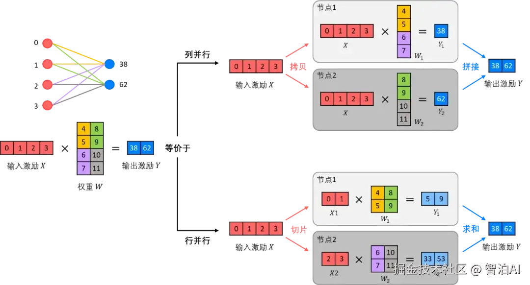 其切分机制主要包含两种:行切分(Row Parallelism),即权重矩阵沿行方向分割;以及列切分(Column Parallelism),即权重矩阵沿列方向分割。