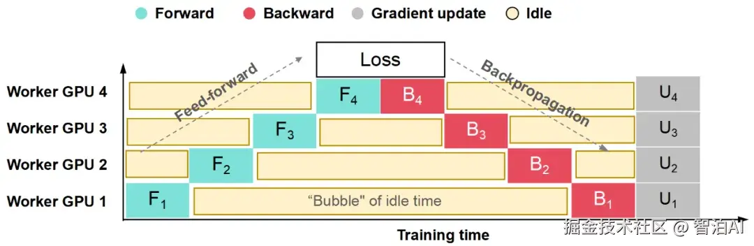 表面上,流水并行似乎呈现串行特性------每个GPU必须等待前序GPU完成计算后才能启动,由此可能引发显著的GPU资源闲置。