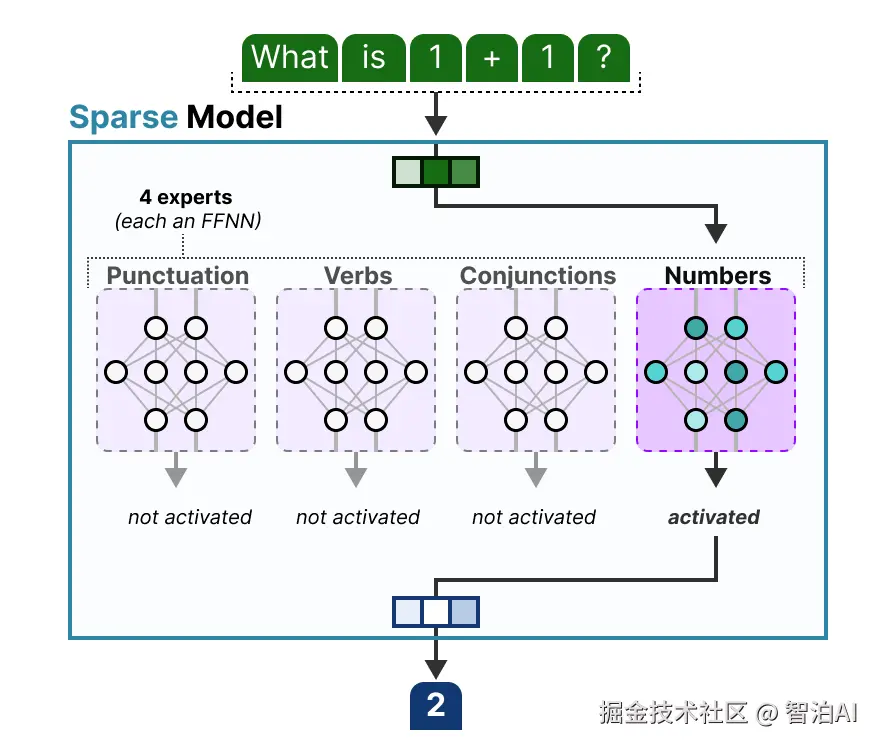 专家层中,每位专家专精于处理某一类token(如语法、语义等)。路由网络依据输入token的特征,动态筛选出少数专家进行激活处理,其余专家保持休眠状态。