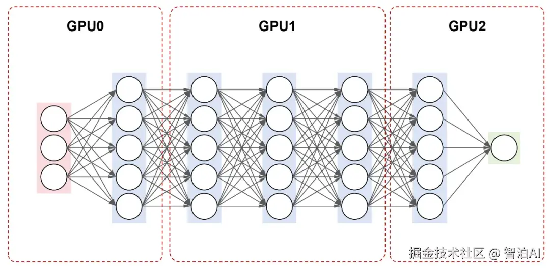 对于一个包含7层的神经网络,可将第12层分配至第一个GPU,第35层部署在第二个GPU,第6~7层置于第三个GPU;训练过程中,数据依序在各GPU间传递处理。