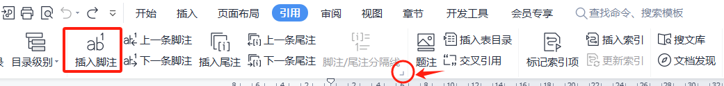1、将光标放置在需要插入脚注的文本之后,然后点击"引用"菜单中的脚注图标右下角的小直角标志。