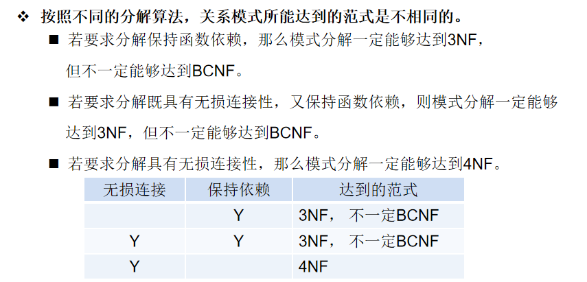 - 这是必须满足的最低标准。如果分解不具有无损连接性,会导致信息丢失或产生虚假元组。只有具有无损连接性的分解才能够保证不丢失信息。无损连接性不一定能解决插入异常、删除异常、修改复杂、数据冗余等问题。
