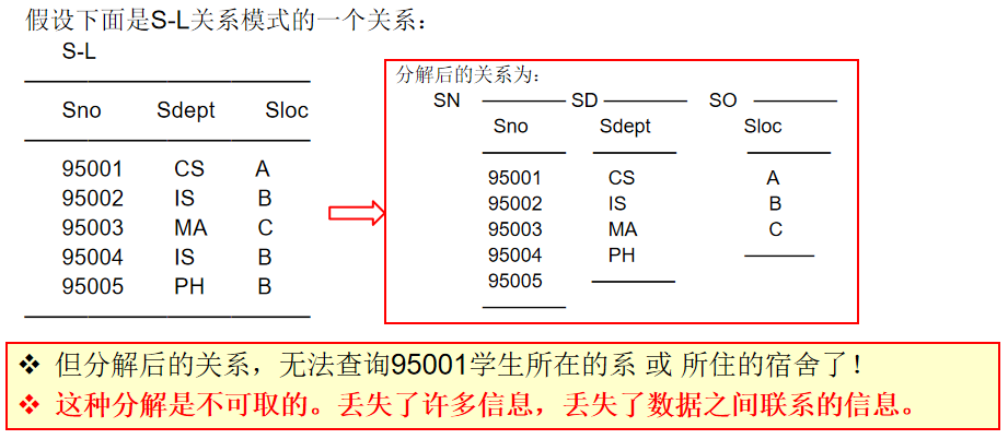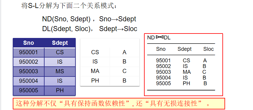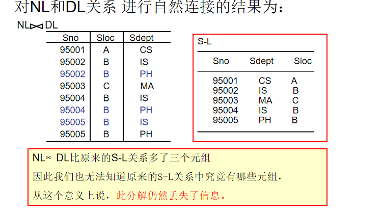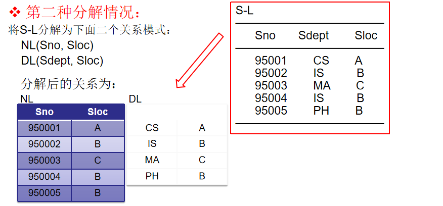 分解方案 :NL(Sno,Sloc)NL(Sno, Sloc)NL(Sno,Sloc) 和 DL(Sdept,Sloc)DL(Sdept, Sloc)DL(Sdept,Sloc)。这里选择用 SlocSlocSloc(宿舍楼)作为两个表的公共属性(连接点)。