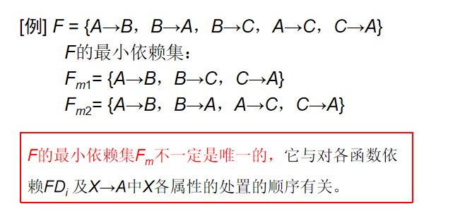 - FmF_mFm 中不存在 这样的函数依赖 X→AX \to AX→A,使得 FmF_mFm 与 Fm−{X→A}F_m - \{X \to A\}Fm−{X→A} 等价。(即:即FFF中的函数依赖均不能由FFF中其他函数依赖导出)。