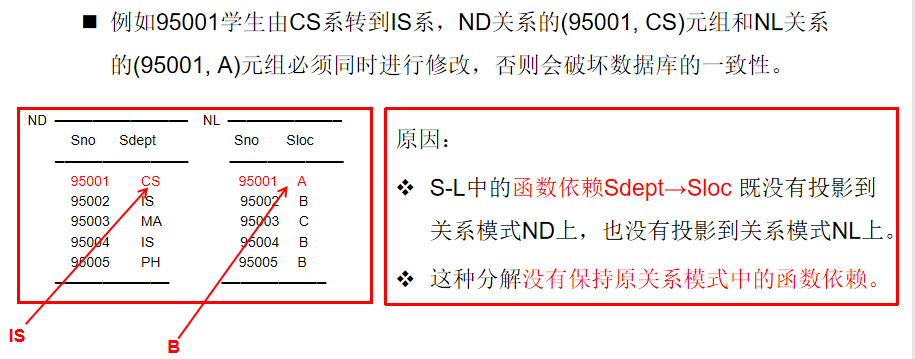 假如 Sdept→SlocSdept \rightarrow SlocSdept→Sloc 规定"CS系必须在A楼"。现在的设计允许在 NDNDND 表里把某学生改成CS系,但在 NLNLNL 表里却忘了把他改到A楼。数据库无法自动检查"CS系对应A楼"这个规则,因为这两个属性分家了。