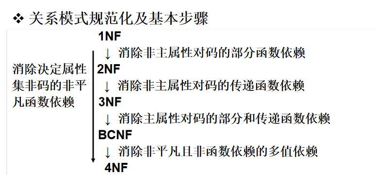 规范化 :1NF →\to→ 2NF →\to→ 3NF →\to→ BCNF →\to→ 4NF 的过程。