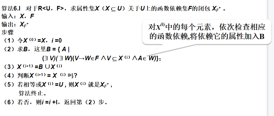 算法 6.1:求属性集**XXX **关于FFF 的闭包 XF+X_F^+XF+,这是一个迭代算法:
