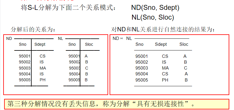 分解方案 : ND(Sno,Sdept)ND(Sno, Sdept)ND(Sno,Sdept) 和 NL(Sno,Sloc)NL(Sno, Sloc)NL(Sno,Sloc)。这里选择用 SnoSnoSno(学号,即主键)作为公共属性。