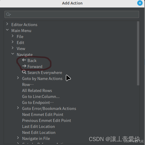 Preferences -> Appearance & Behavior -> Menus and Toolbars -> Navigation Bar Toolbar -> Toolbar Run Actions ,选择add sction 按钮,选择Main menu -> Navigate -> 勾选Back 和Forward按钮。