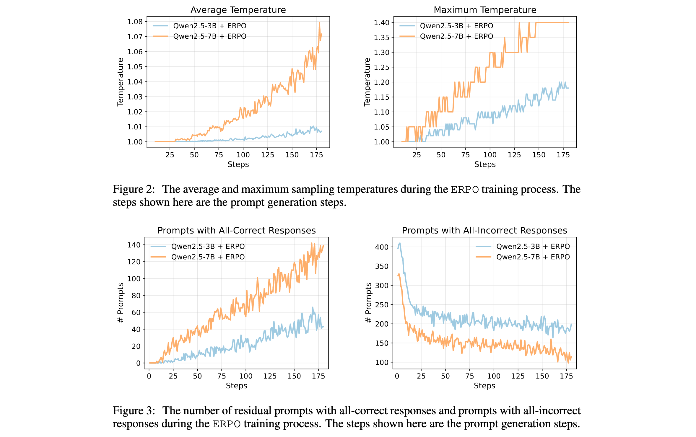 \[图2\]显示了ERPO训练过程中的平均和最大采样温度。最大温度线性增加,而平均温度指数增加,表明更多提示变为残余提示,其采样温度被ERPO提高。设置温度上限 T max T_{\\max} Tmax对于防止采样温度不受控制地增长是必要的。