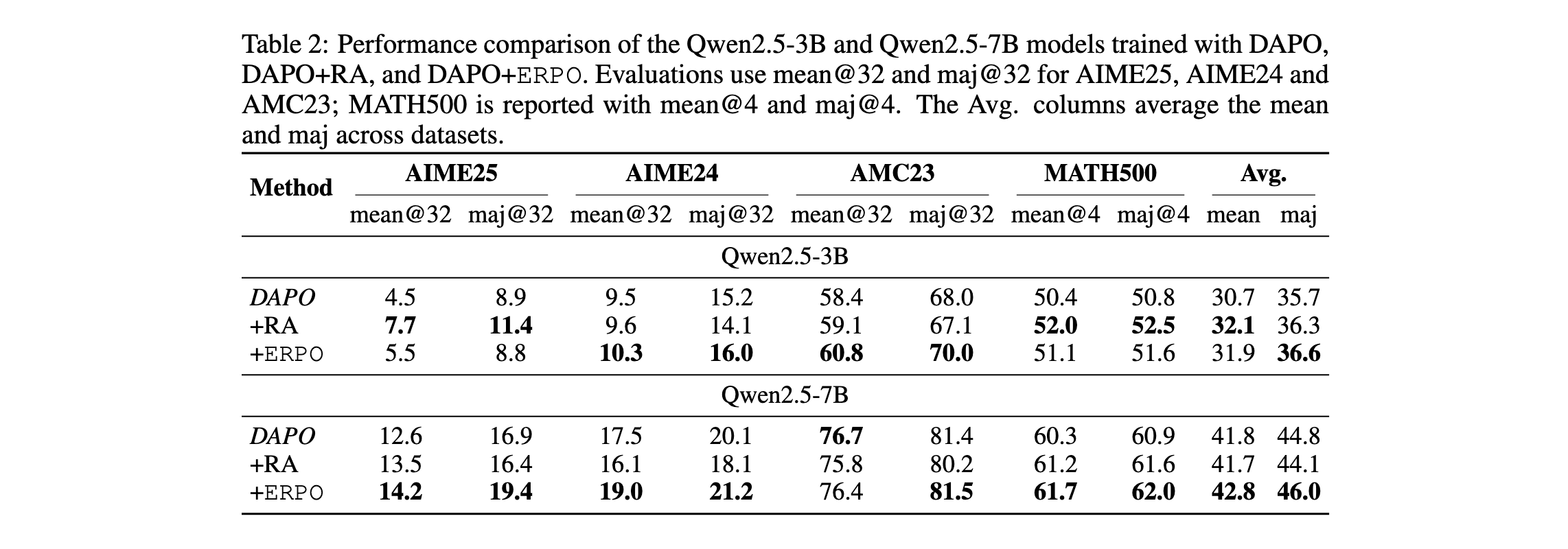 在Qwen2.5-7B上,ERPO在平均和多数投票准确率上都实现了与DAPO和RA相比的最佳整体性能,表明该算法的可扩展性。在AIME2025上,ERPO相比基线取得了最大的改进,mean@32和maj@32分别提升约12%和16%。