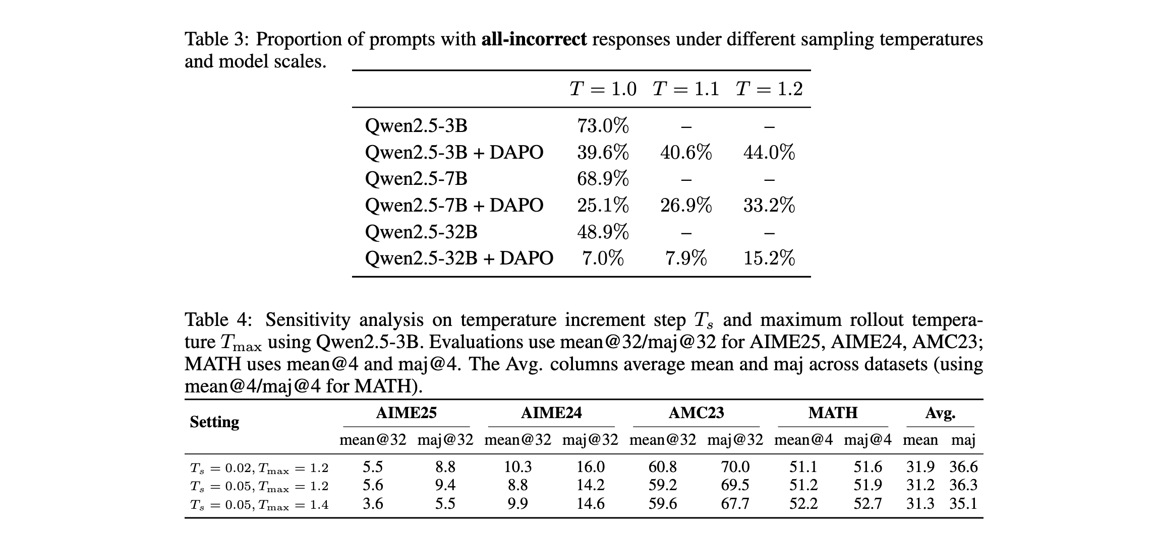 初始rollout温度 T 0 T_0 T0设置为1.0。温度增量步 T s T_s Ts在Qwen2.5-3B上设置为0.02,在Qwen2.5-7B上设置为0.05,而最大rollout温度 T max T_{\max} Tmax在Qwen2.5-3B上设置为1.2,在Qwen2.5-7B上设置为1.4。奖励分配为正确响应1分,否则-1分。