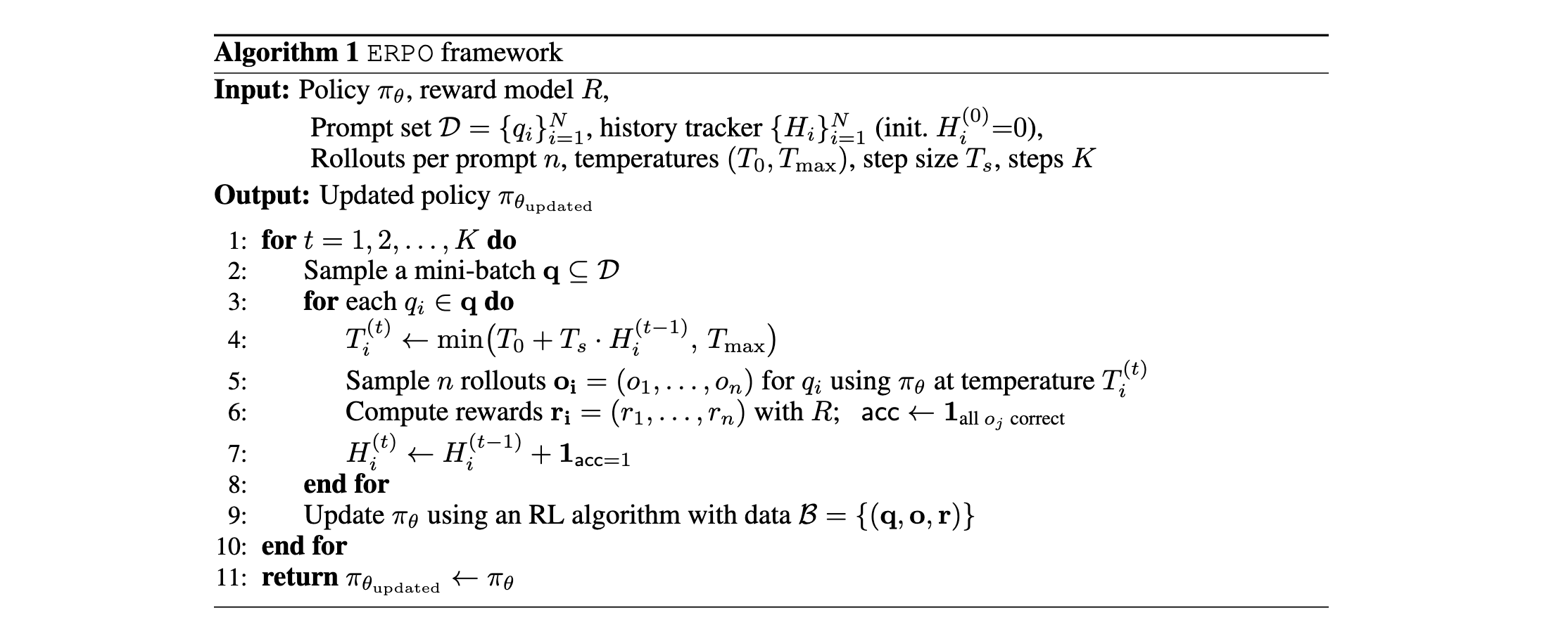 其中, T 0 T_0 T0、 T max T_{\max} Tmax和 T s T_s Ts是超参数,分别表示初始温度、最大温度和温度步长。通过这种方式,ERPO逐渐增加残余提示的采样温度,直到策略生成错误响应。这使得ERPO能够在重新激活训练信号、鼓励探索和保持合理的分布偏移之间取得平衡。