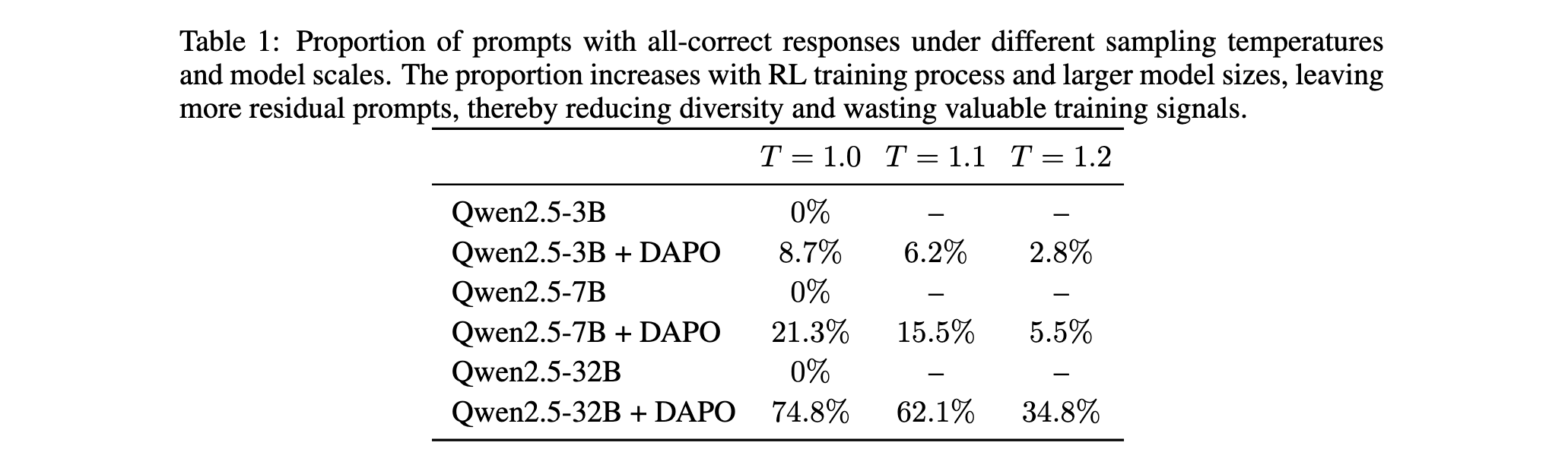 如[表1]所示,在Qwen2.5-32B模型上经过DAPO训练后,在T=1.0的采样温度下,高达74.8%的提示都会产生全正确的响应。这些残余提示虽然在当前策略下已经"学会",但它们仍然包含有价值的信息,可以帮助模型保持已获得的能力,并可能产生新的推理轨迹。更重要的是,这些提示并不真正健壮------微小的扰动(如增加采样温度)就很容易诱发错误。