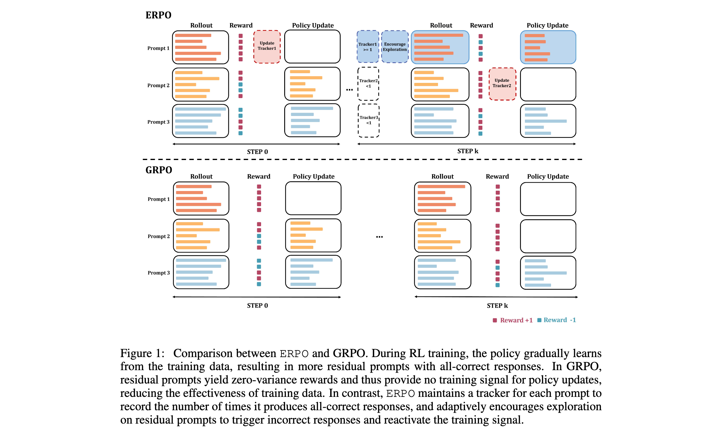 通过这种设计,ERPO能够有效地利用训练过程中被遗弃的残余提示,提高训练多样性,并在不牺牲训练稳定性的前提下提升模型性能。