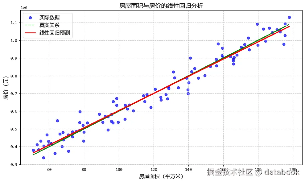 # 真实的线性关系:房价 = 5000 * 面积 + 100000 + 随机噪声