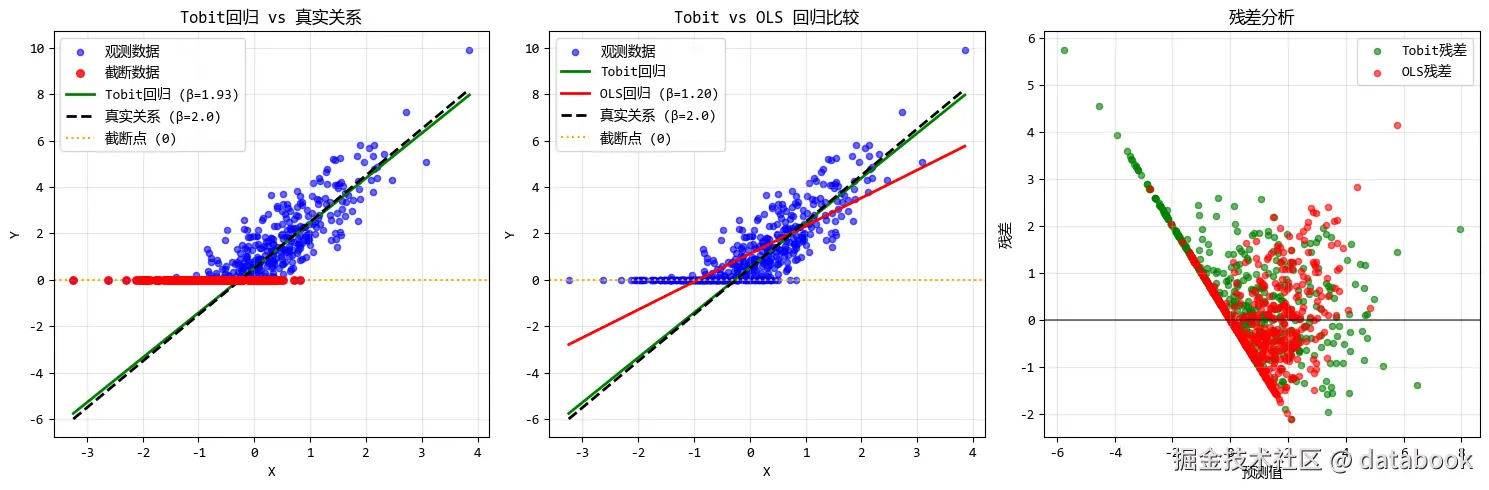 print(f"系数估计偏差 (Tobit): {abs(tobit_model.beta - true_beta):.3f}")