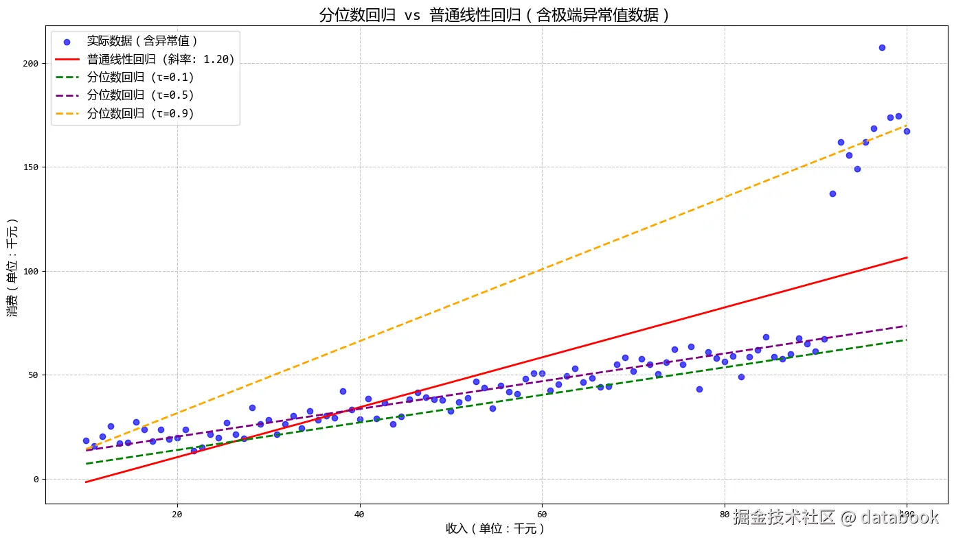 - 异常值很多: 考虑 分位数回归 或 Huber回归(鲁棒回归)。