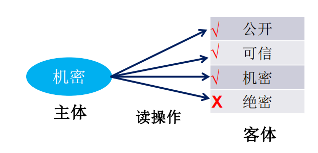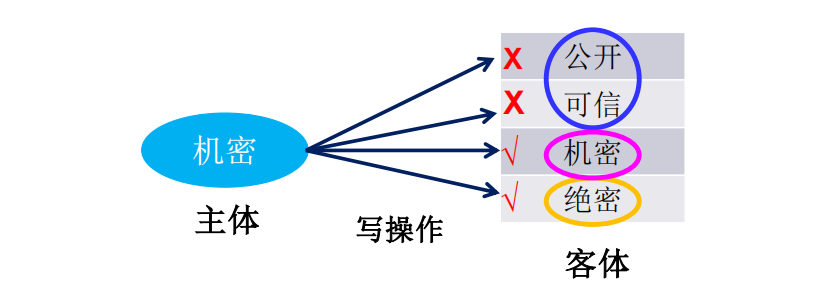 - 例子:"机密"主体可以写"机密"、"绝密"客体,但不能 写"公开"、"可信"客体。这是为了防止高密级数据被"泄露"到低密级文件中。