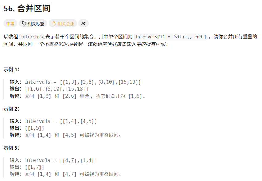 以数组 intervals 表示若干个区间的集合,其中单个区间为 intervals[i] = [starti, endi] 。请你合并所有重叠的区间,并返回 一个不重叠的区间数组,该数组需恰好覆盖输入中的所有区间 。