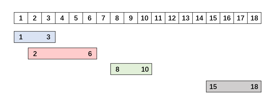 图上可以看得蓝色的[1,3]和粉色的[2,6]重合了,可以发现判断重合最重要的就是前面一组数的end和后面一组数的start进行比较,也就是蓝色的3和粉色的2进行比较,如果第二组数的stat<=第一组数的end,那么就可以进行合并。例子中粉2<=蓝3,就可以进行合并。因为一开始已经进行过排序了,所以这时候只需要前后二组两两比较就可以了。