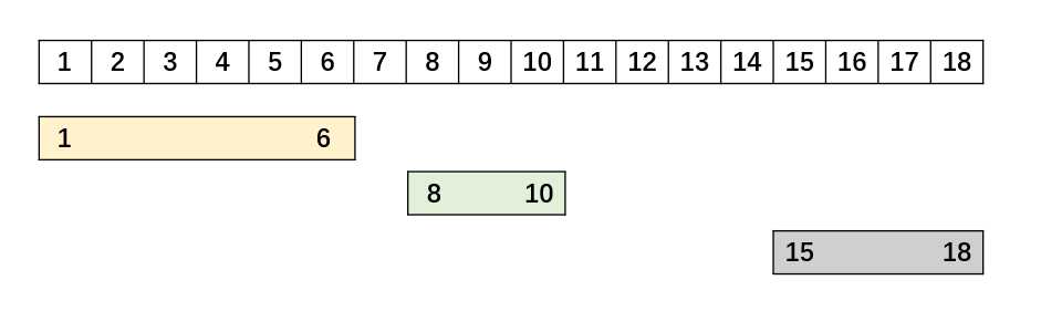 start的值只需要沿用前面的区间的start就可以,因为因为排序已经保证当前合并区间的start位置一定是这两个区间中最靠左的那个。真正需要更新的是end位置,它应该延伸到两个区间中能到达的最远位置,所以只需要取两个区间的end值的max就好了。比如这里合并前的[1,3]中的3和[2,6]中的6比较,6是更大的,那么就选6作为新的end,最终合并成黄色的那块区间[1,6]。