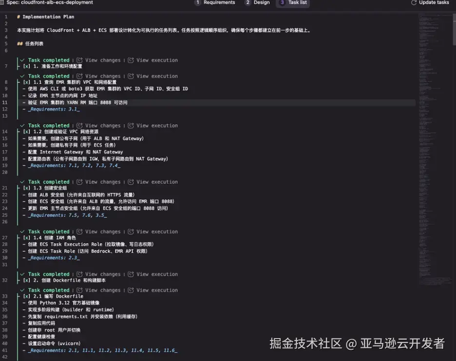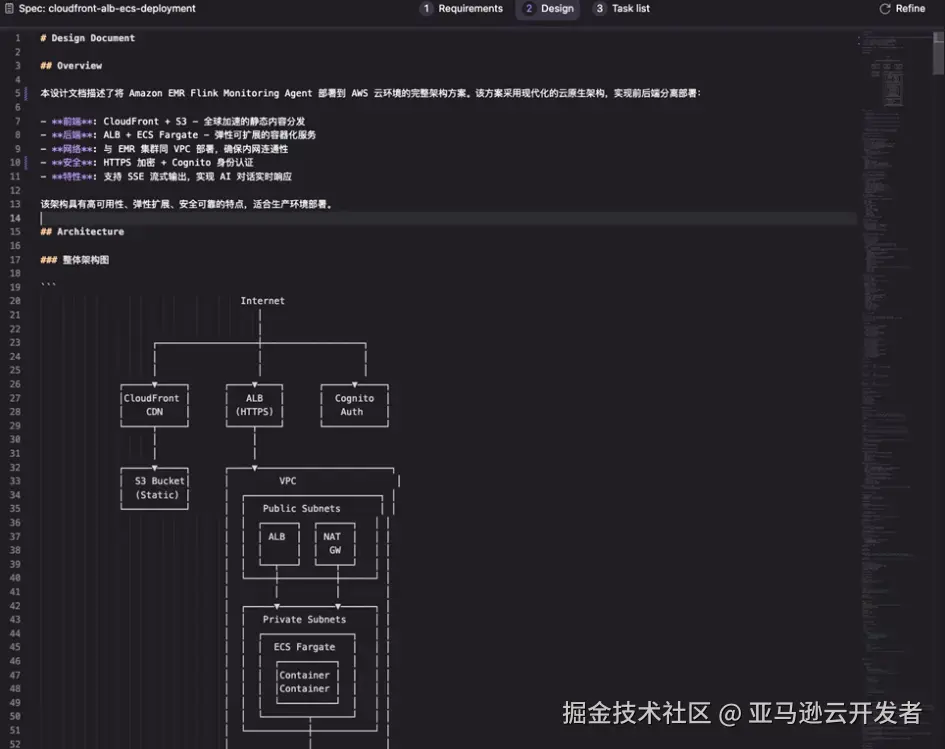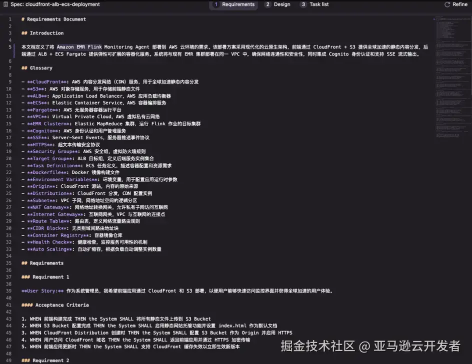 Kiro 帮我在 .kiro/specs/cloudfront-alb-ecs-deployment/ 创建了三个文档: