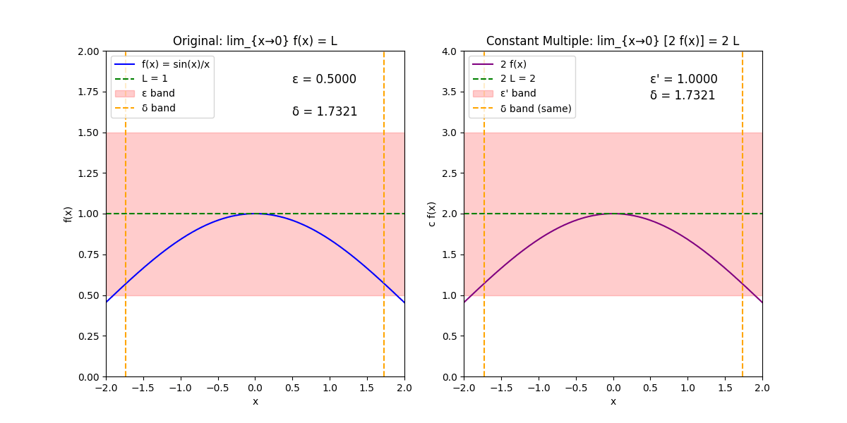 ax2.set_title(f'Constant Multiple: lim_{{x→0}} [{c} f(x)] = {c} L')