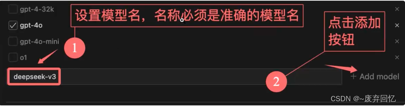 点击按钮后,会出现一个输入框,我们输入模型名,比如deepseek-v3及deepseek-r1.